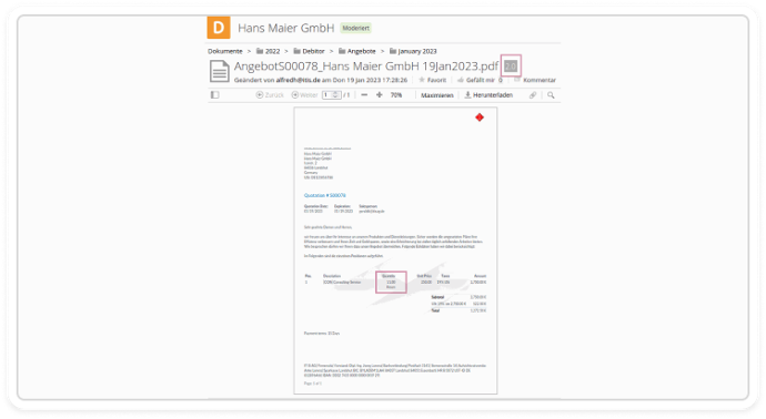 During the upload process, a link to the respective document is automatically inserted. Through this link, the documents stored in ITISeasy.docs can be opened in ITISeasy.business anytime.