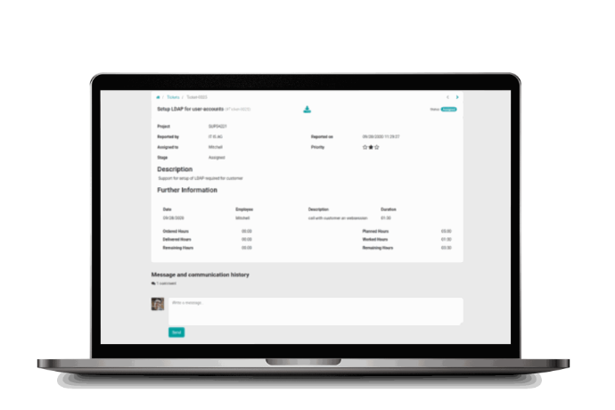 Assign tickets to teams or individuals, set priorities, and escalate if needed. Log work hours using the timer or manually. Every message appears in the chatter and is synced to the customer portal. All work logs are invoice-ready.